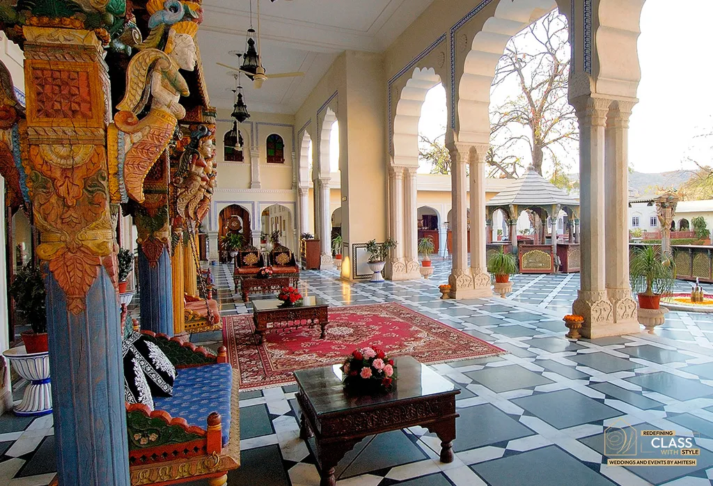 Once the residence of Jaipur’s royals, this palace exudes grandeur with traditional architecture, private courtyards, gold-plated details, and antique artefacts. Couples seeking a boutique royal venue often shortlist this property while exploring premium wedding venues in jaipur for a private and opulent celebration.